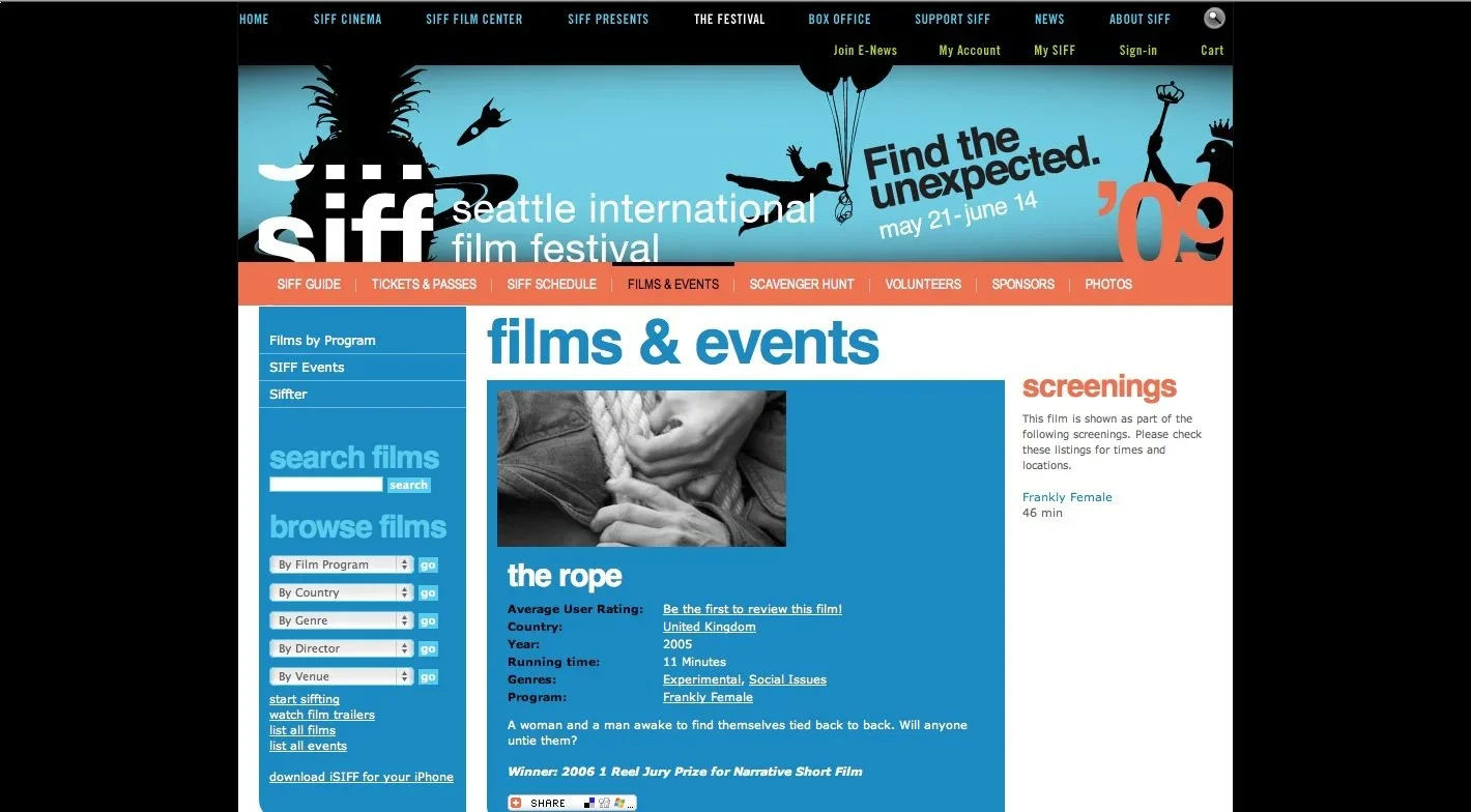 The Los Angeles International Short Film Festival Official Selection The New York City Big Apple Film Festival Official Selection The San Francisco Independent Film Festival Official Selection The 13th Raindance Film Festival Official Selection The Manchester Festival of Fantastic Films Official Selection The Portobello Film Festival Official Selection The Louis Vuitton Hawaii Film Festival Official Selection Paris Tout Court-International Short Film Festival Official Selection The Sarasota Film Festival Official Selection The Newport Film Festival Official Selection The Palm Spring Film Festival Official Selection One Reel Film Festival Official Selection The San Diego Film Festival Official Selection